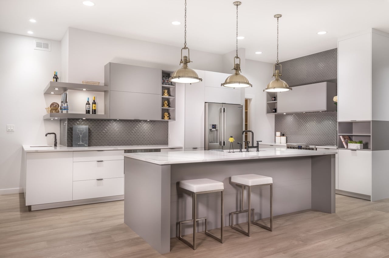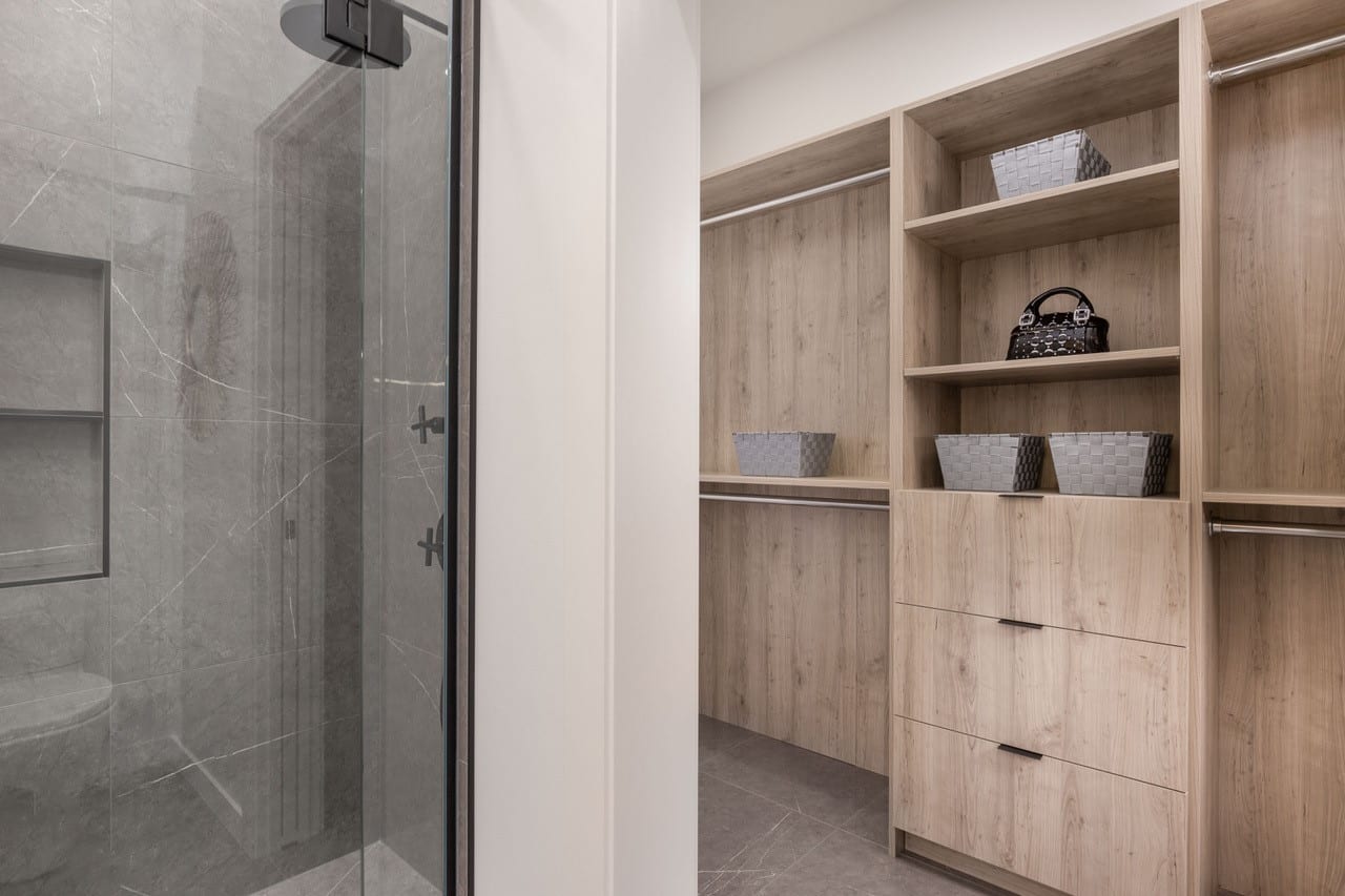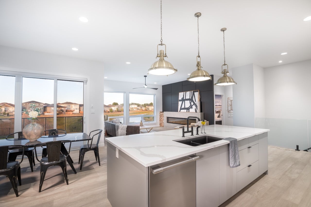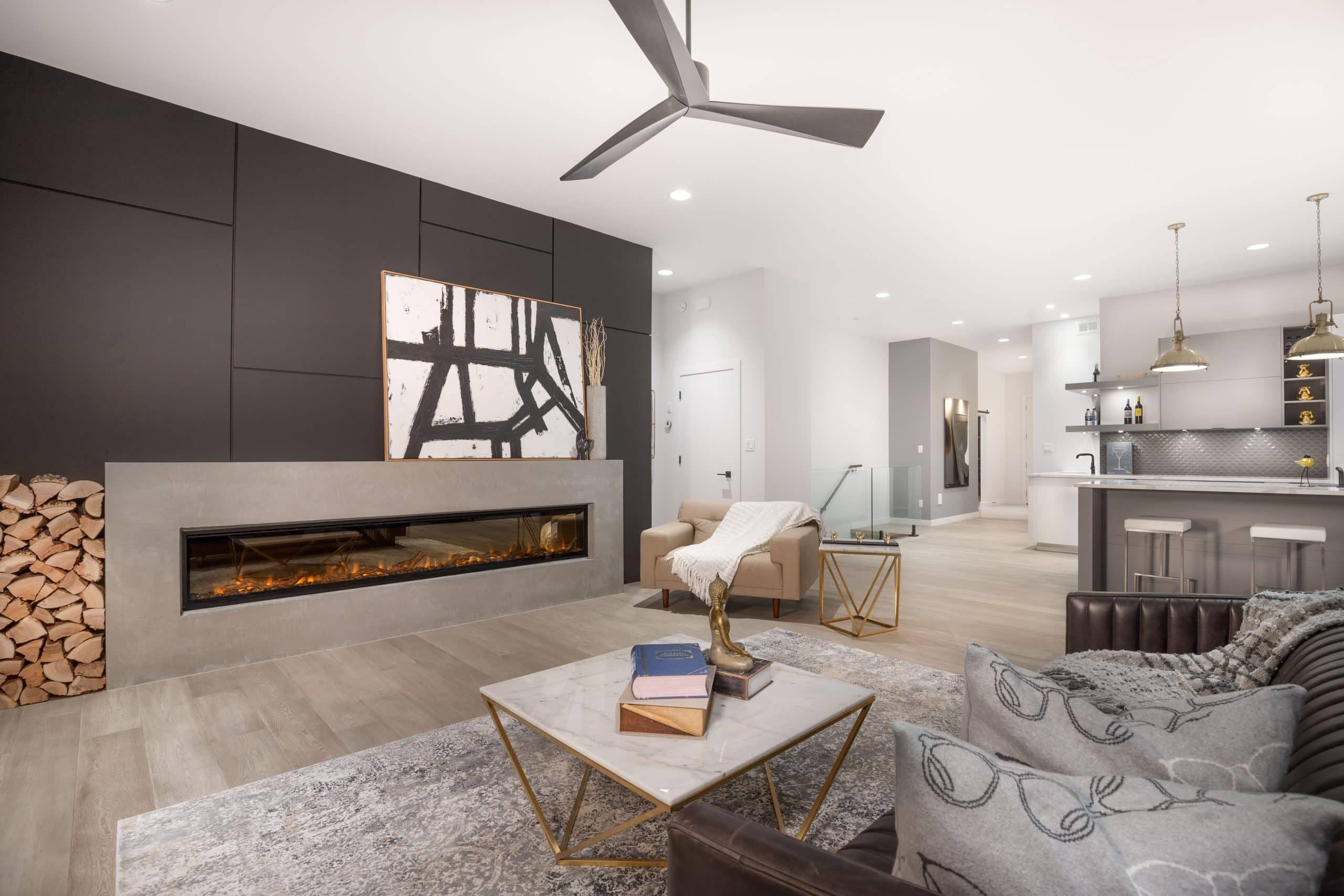 The 7 Tanager Residence showcases Netley Millwork’s modern craftsmanship with a seamless blend of style and functionality. The kitchen anchors the home with sleek cabinetry, expansive quartz countertops, and a striking island illuminated by bold pendant lighting, while the open layout flows naturally into the dining and living areas. A feature fireplace wall and soft-toned floors bring warmth and sophistication to the main spaces, complemented by abundant natural light. Bedrooms offer calm, minimalist retreats, and spa-inspired bathrooms feature floating vanities, modern fixtures, and refined tilework. Throughout the home, custom storage solutions and carefully chosen finishes create a cohesive, elegant environment that feels both inviting and contemporary.
