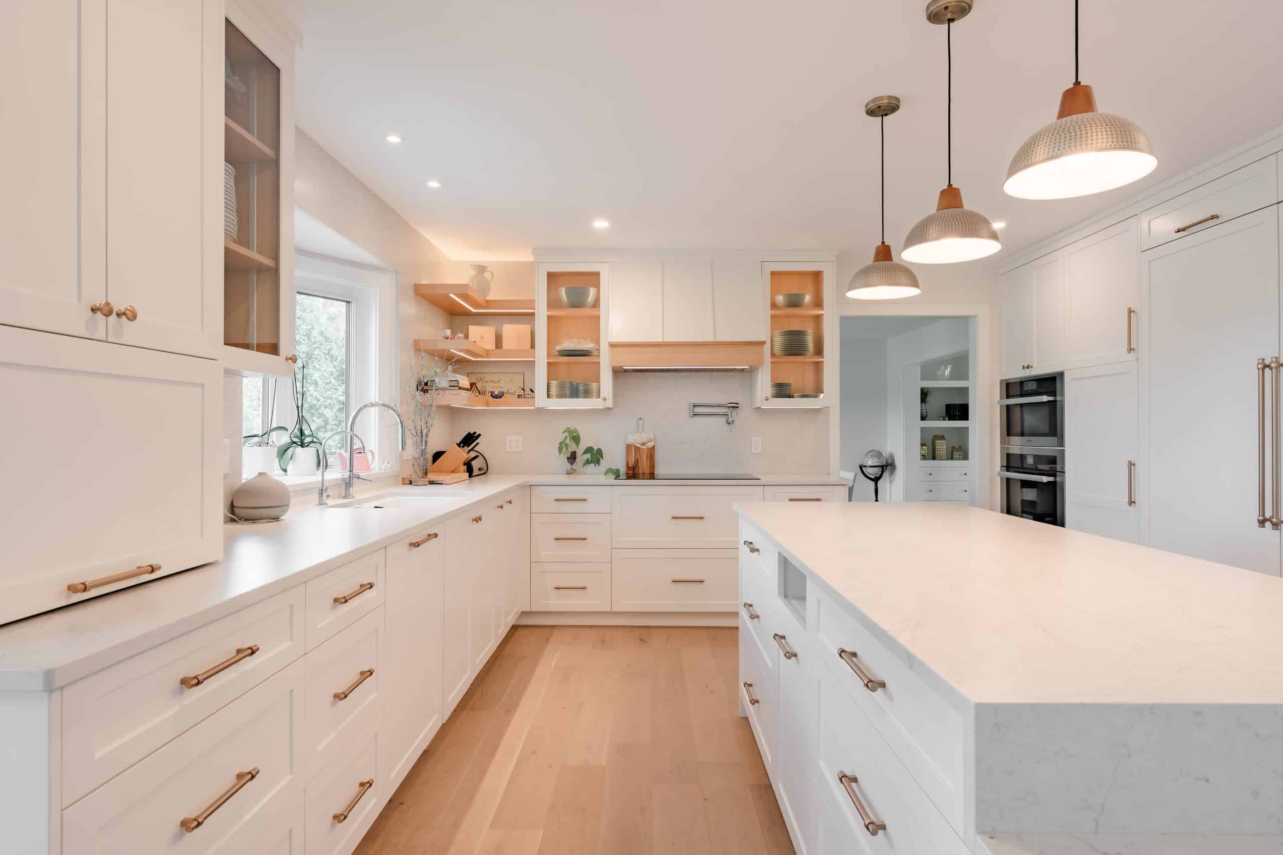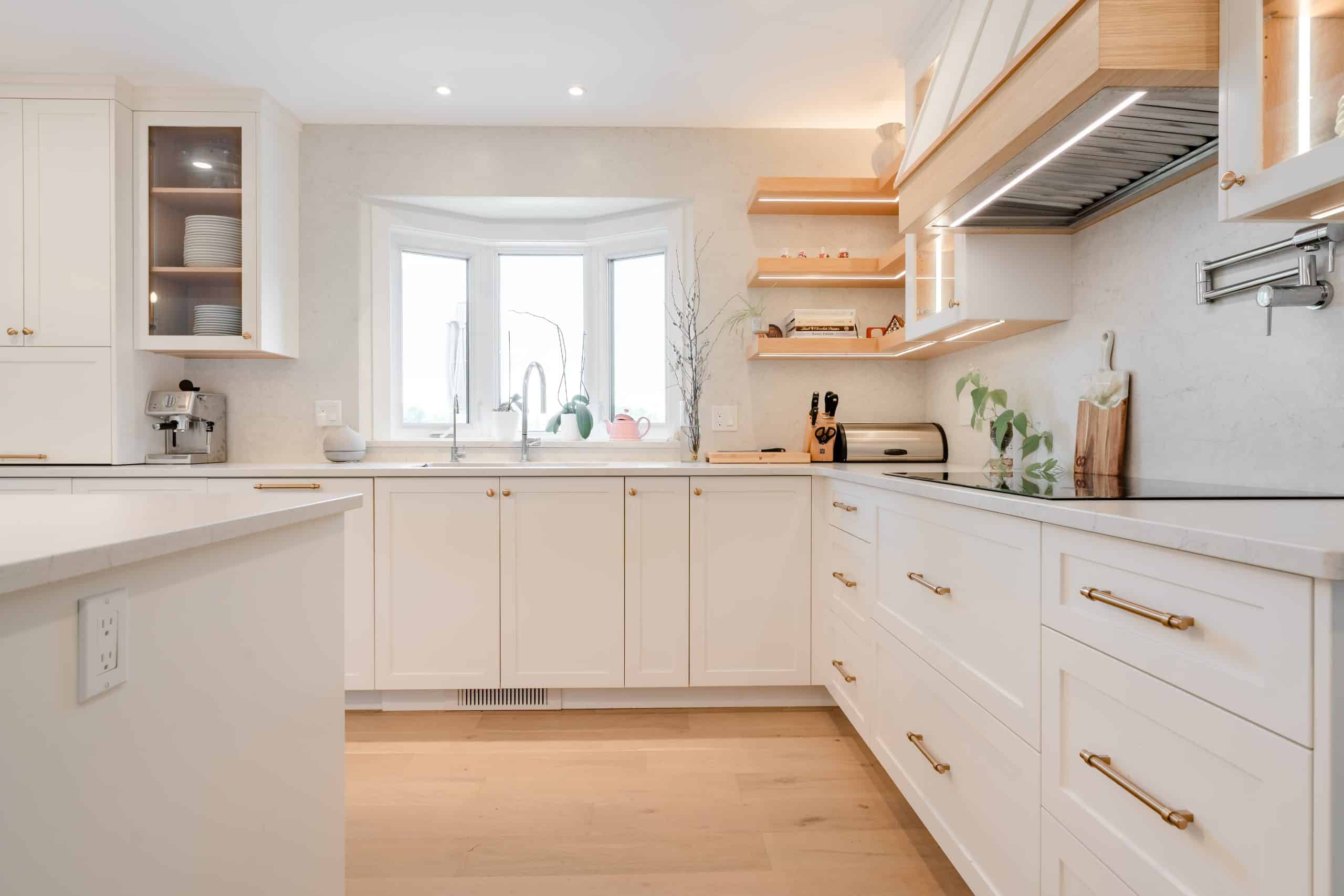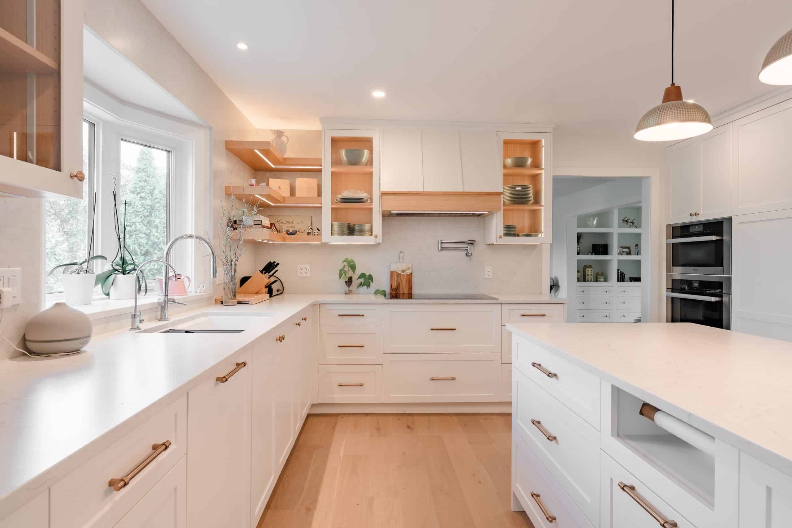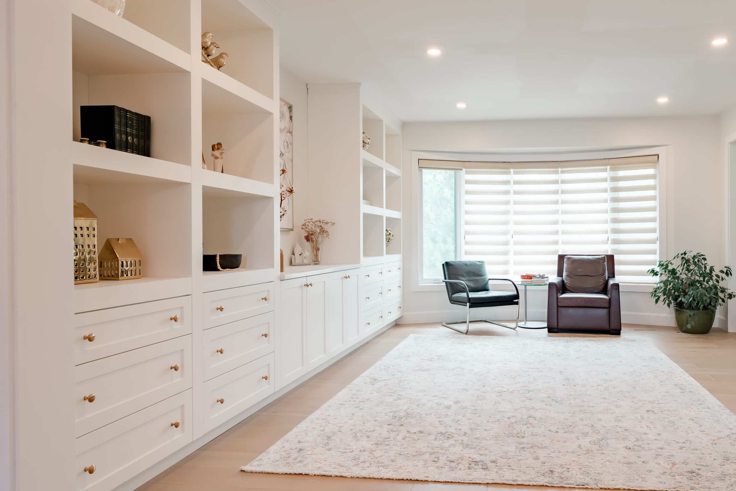 The Hildebrand Residence by Netley Millwork is a stunning showcase of transitional elegance, blending timeless shaker-style cabinetry with natural wood details and modern functionality. The kitchen features bright white cabinets paired with warm wood accents, including a custom range hood and floating shelves, complemented by brushed brass hardware that adds a subtle touch of luxury. Expansive quartz countertops and a spacious island create both a practical workspace and a welcoming hub for gathering. Built-in shelving units extend the design into the living areas, offering clean-lined storage and curated display opportunities that highlight the home’s cohesive style. A thoughtfully designed mudroom maximizes utility with custom shoe storage and cabinetry, while additional spaces, such as the bar area and accent millwork, bring continuity and refinement throughout the home. The result is a light-filled, inviting residence where craftsmanship, detail, and modern living harmoniously meet.