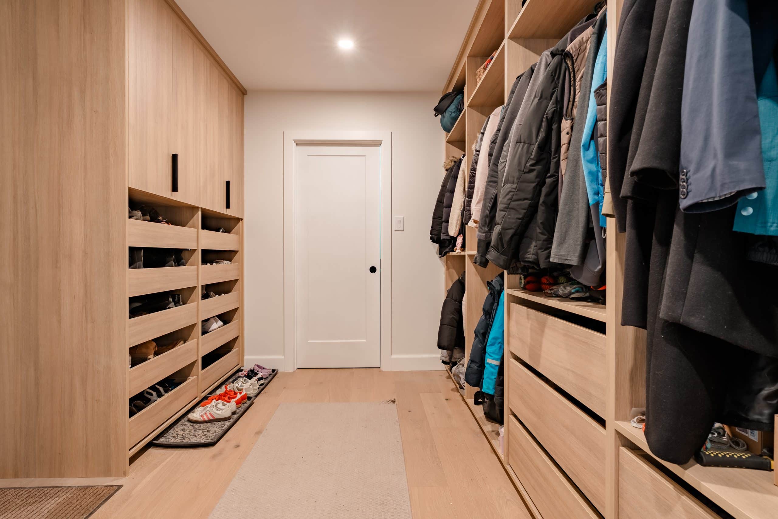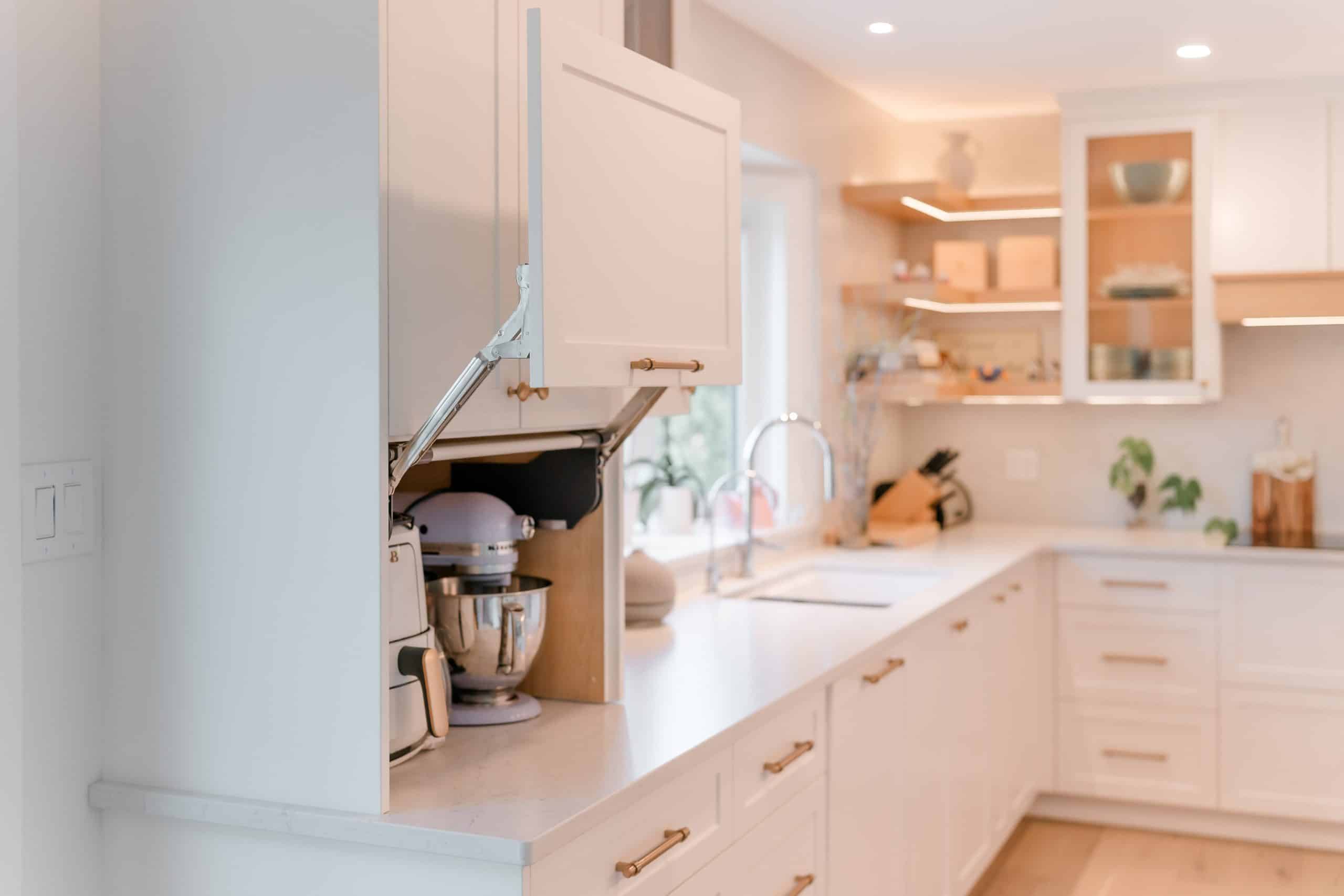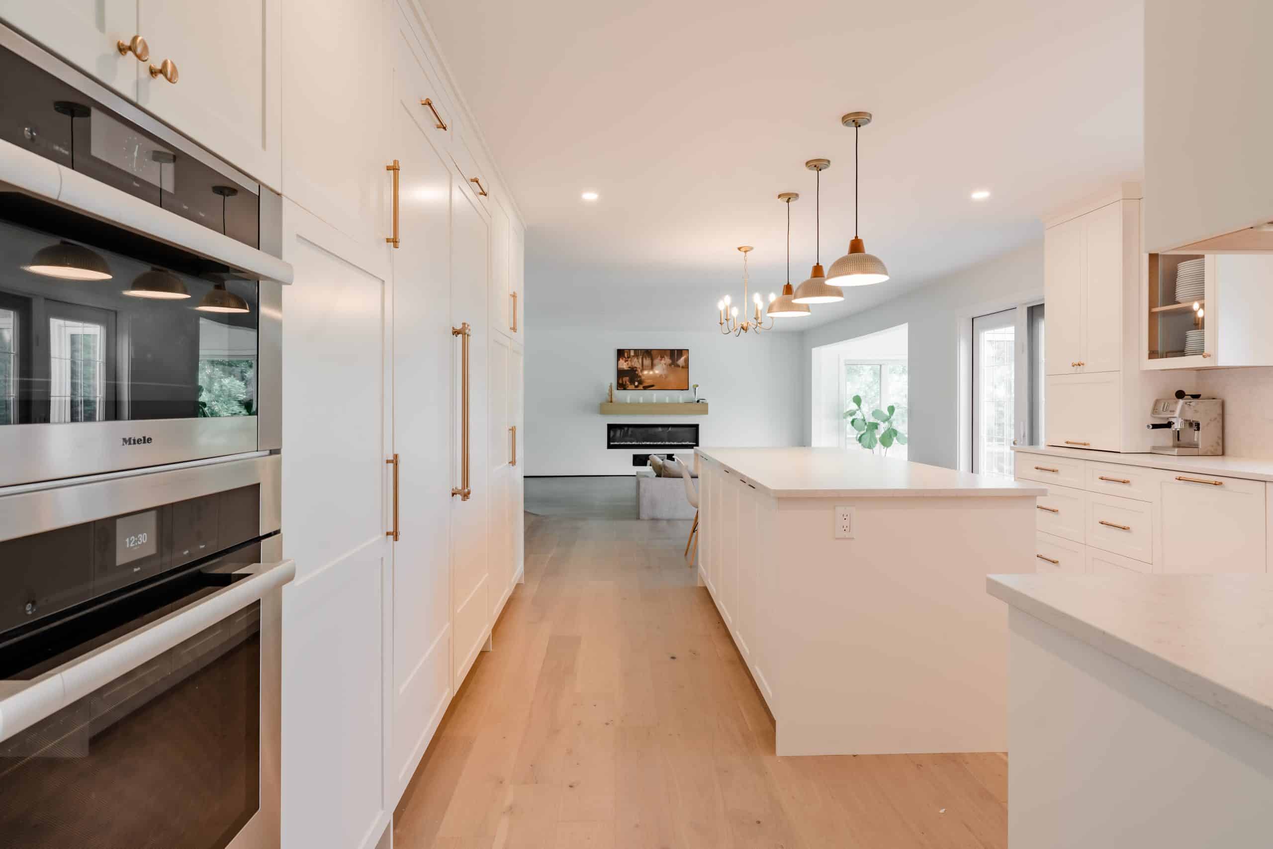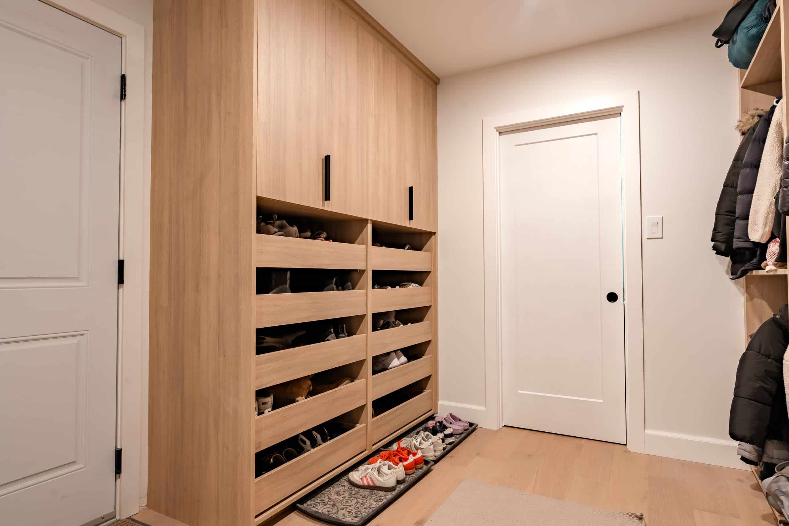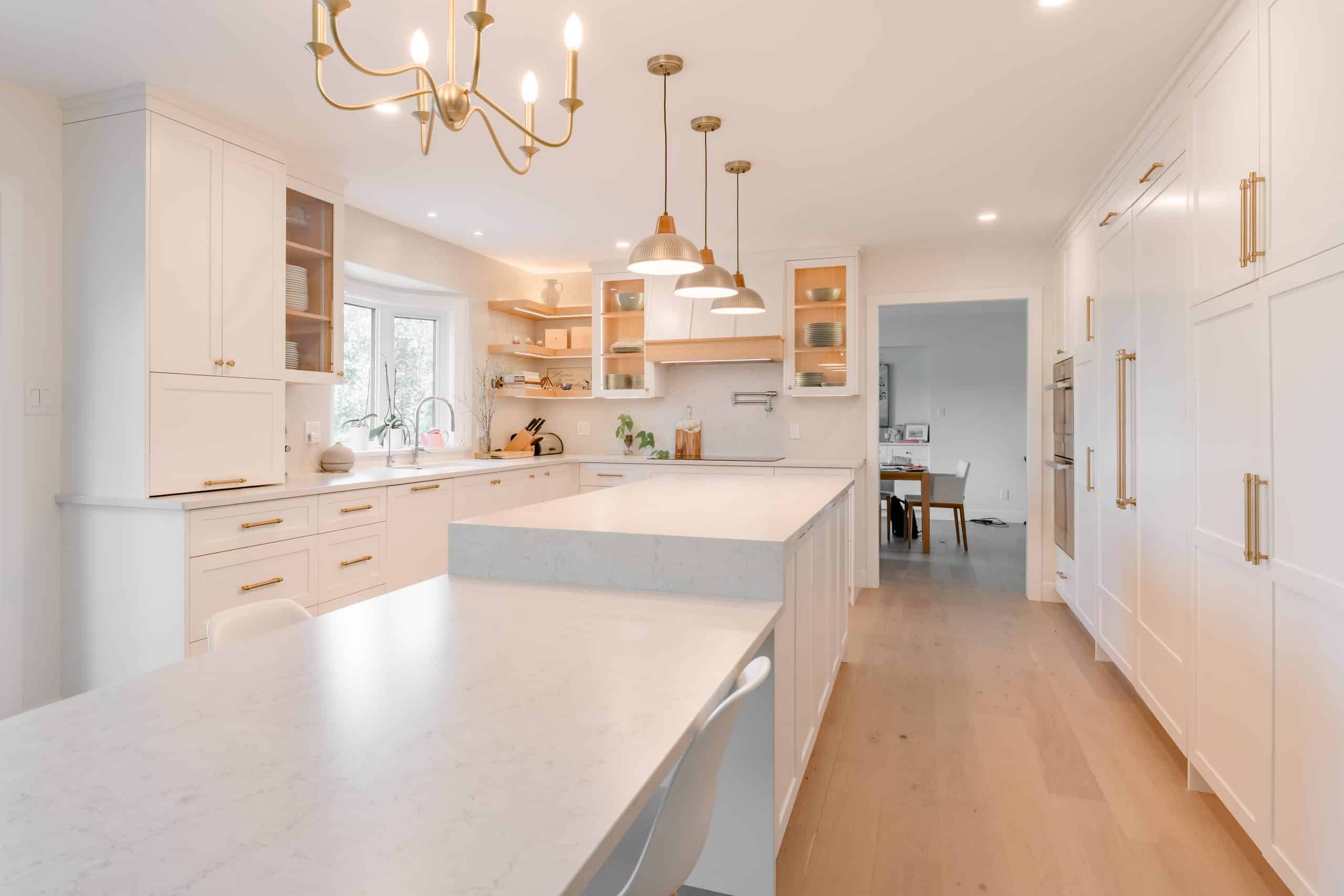 The Hildebrand Residence by Netley Millwork is a stunning showcase of transitional elegance, blending timeless shaker-style cabinetry with natural wood details and modern functionality. The kitchen features bright white cabinets paired with warm wood accents, including a custom range hood and floating shelves, complemented by brushed brass hardware that adds a subtle touch of luxury. Expansive quartz countertops and a spacious island create both a practical workspace and a welcoming hub for gathering. Built-in shelving units extend the design into the living areas, offering clean-lined storage and curated display opportunities that highlight the home’s cohesive style. A thoughtfully designed mudroom maximizes utility with custom shoe storage and cabinetry, while additional spaces, such as the bar area and accent millwork, bring continuity and refinement throughout the home. The result is a light-filled, inviting residence where craftsmanship, detail, and modern living harmoniously meet.