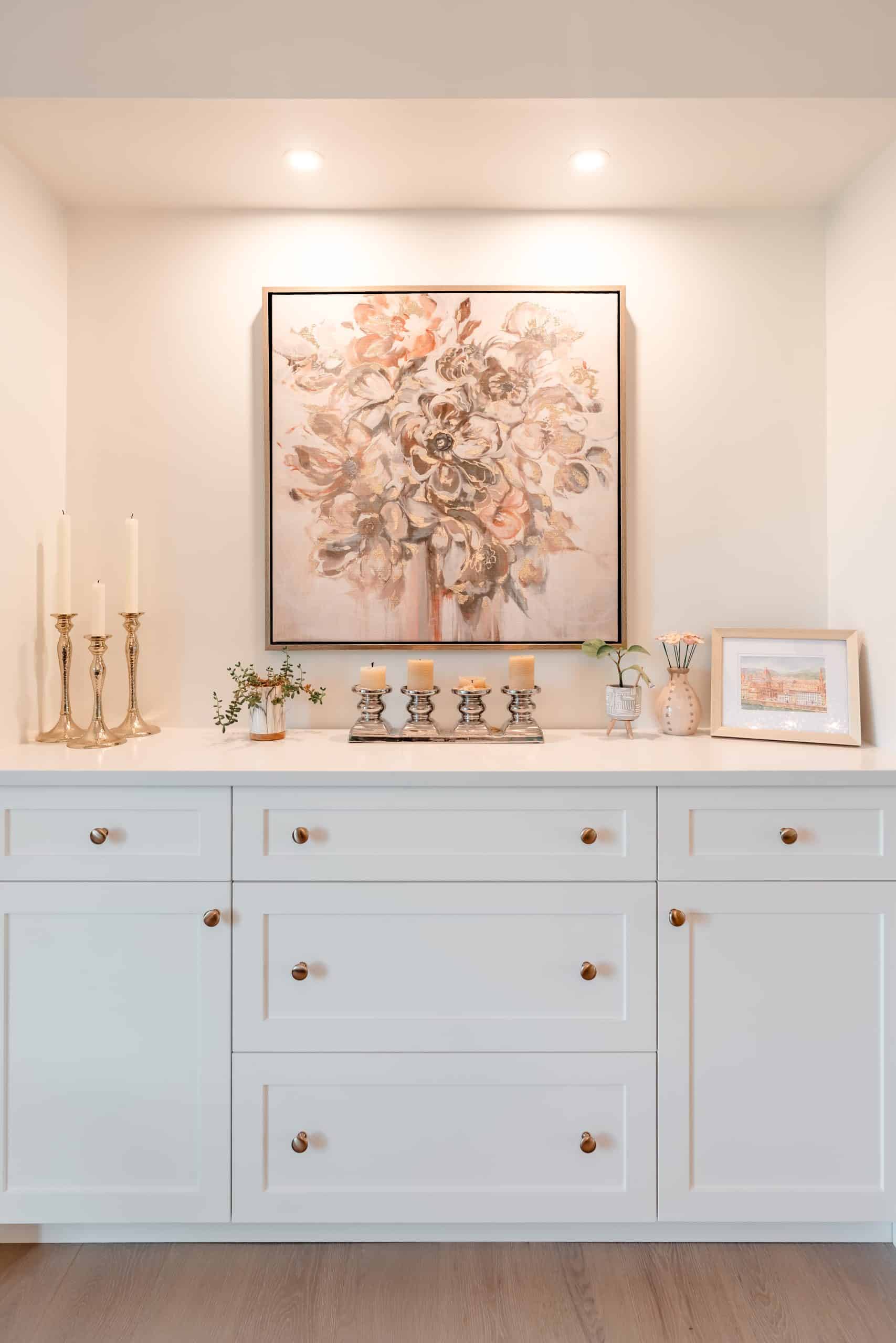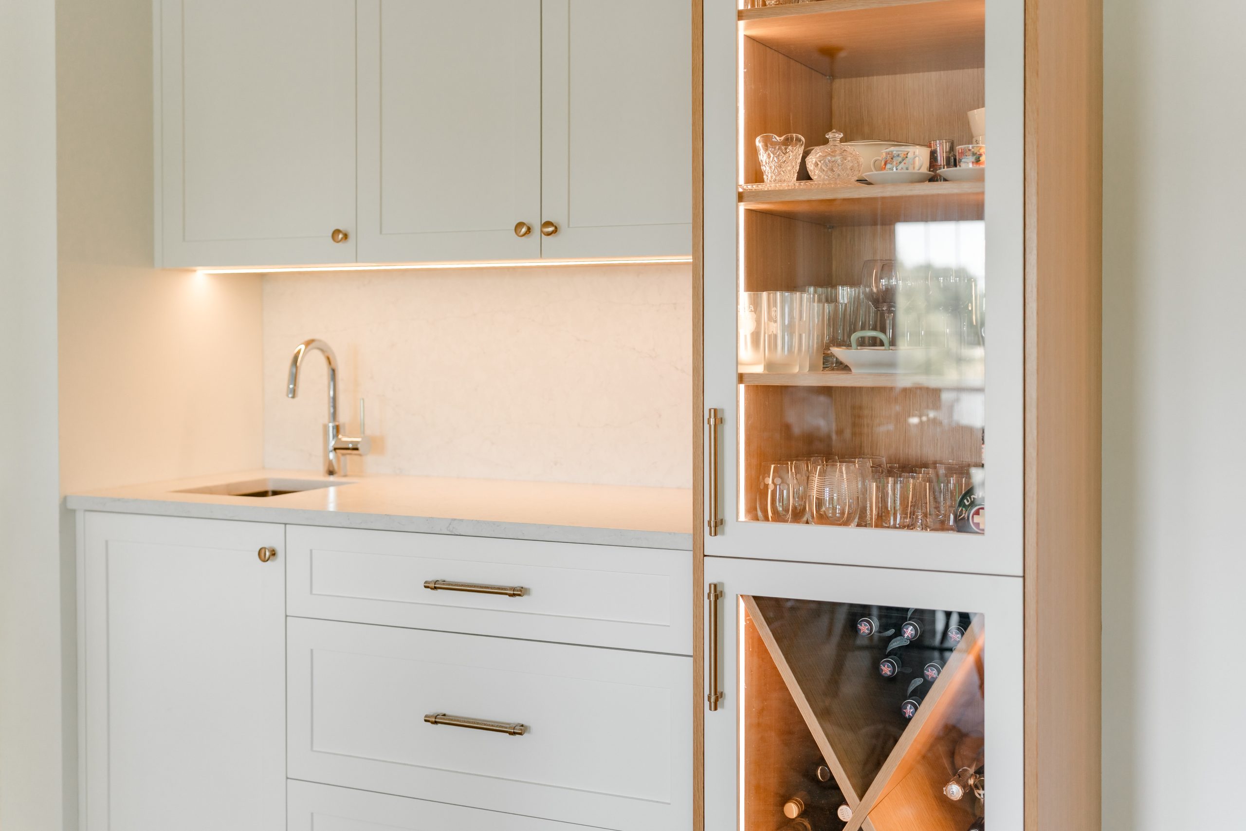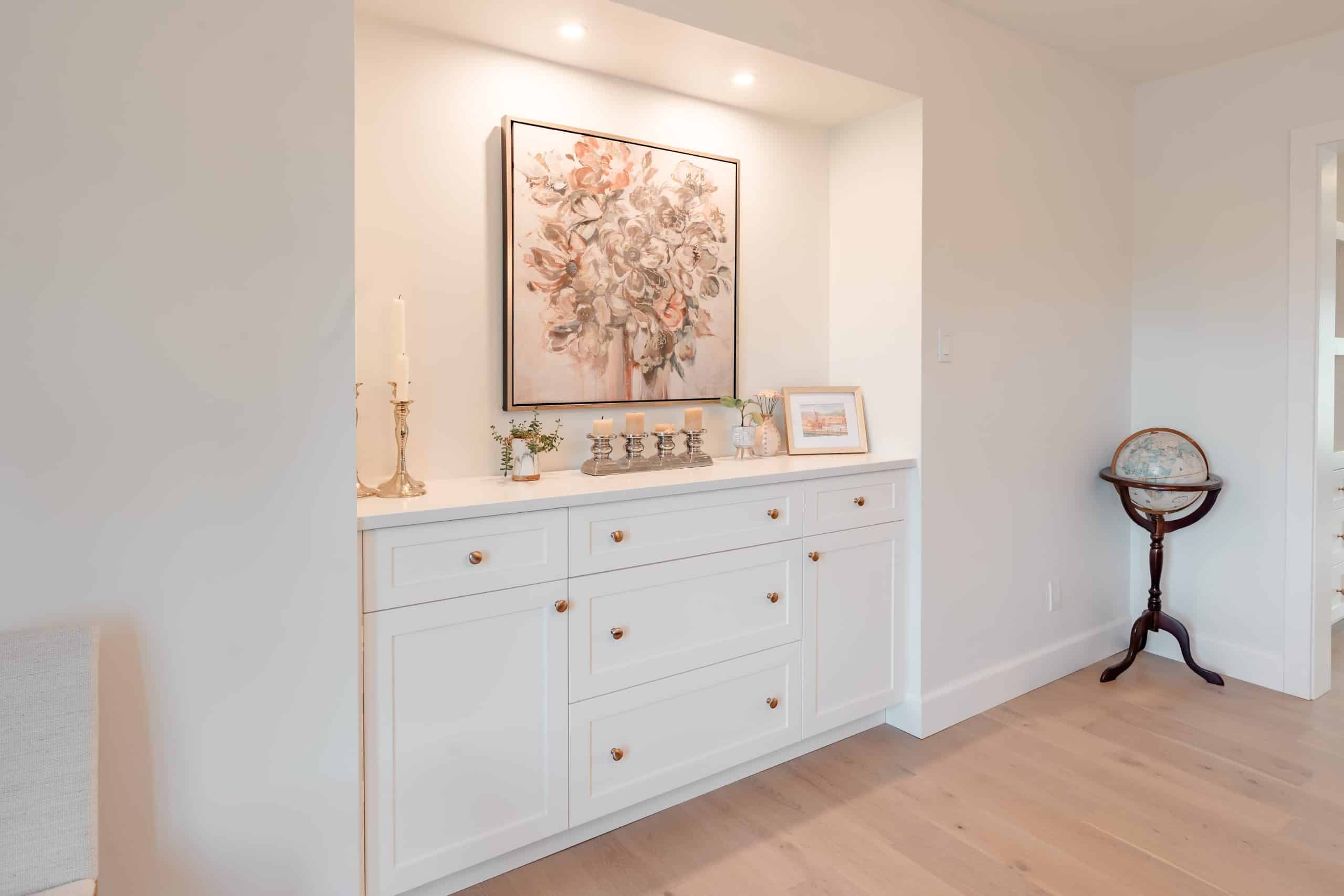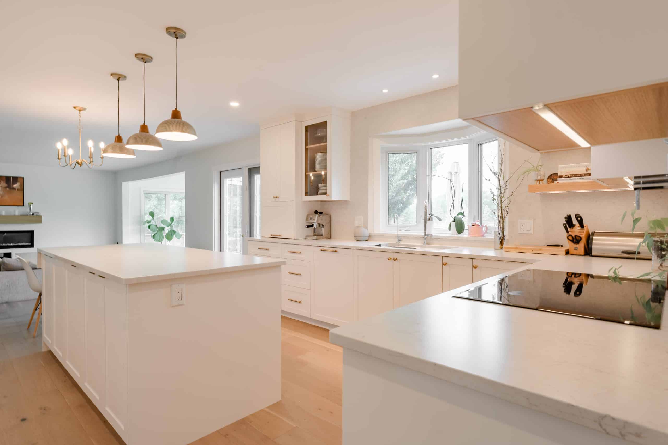 The Hildebrand Residence by Netley Millwork is a stunning showcase of transitional elegance, blending timeless shaker-style cabinetry with natural wood details and modern functionality. The kitchen features bright white cabinets paired with warm wood accents, including a custom range hood and floating shelves, complemented by brushed brass hardware that adds a subtle touch of luxury. Expansive quartz countertops and a spacious island create both a practical workspace and a welcoming hub for gathering. Built-in shelving units extend the design into the living areas, offering clean-lined storage and curated display opportunities that highlight the home’s cohesive style. A thoughtfully designed mudroom maximizes utility with custom shoe storage and cabinetry, while additional spaces, such as the bar area and accent millwork, bring continuity and refinement throughout the home. The result is a light-filled, inviting residence where craftsmanship, detail, and modern living harmoniously meet.